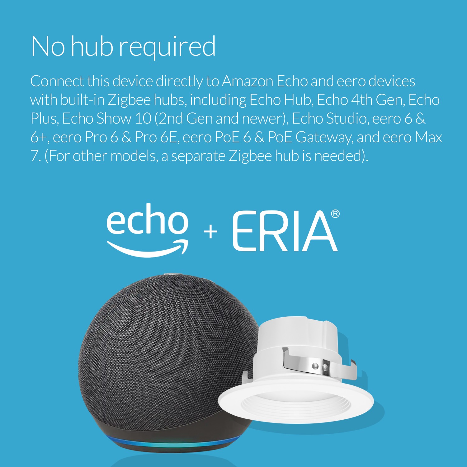 Connect this device directly to Amazon Echo and eero devices with built-in Zigbee hubs, including Echo Hub, Echo 4th Gen, Echo Plus, Echo Show 10 (2nd Gen and newer), Echo Studio, eero 6 & 6+, eero Pro 6 & Pro 6E, eero PoE 6 & PoE Gateway, and eero Max 7. (For other models, a separate Zigbee hub is needed).