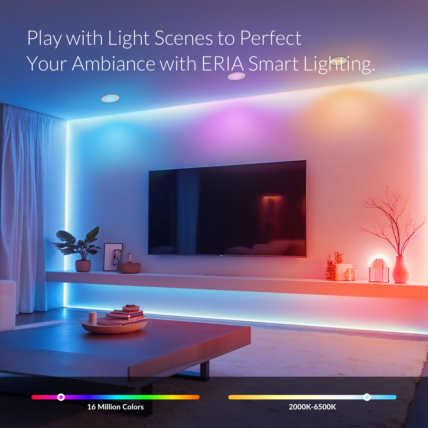 Imagine painting your home with colors that perfectly match every mood and occasion. Energize lively gatherings, create a festive holiday atmosphere, or make movie nights cozy. When it’s time to meditate, set a tranquil scene. Creating the perfect ambiance is effortless. This isn’t just a dream; it’s what ERIA Smart Lighting brings to your daily life, making every moment uniquely yours while saving energy.