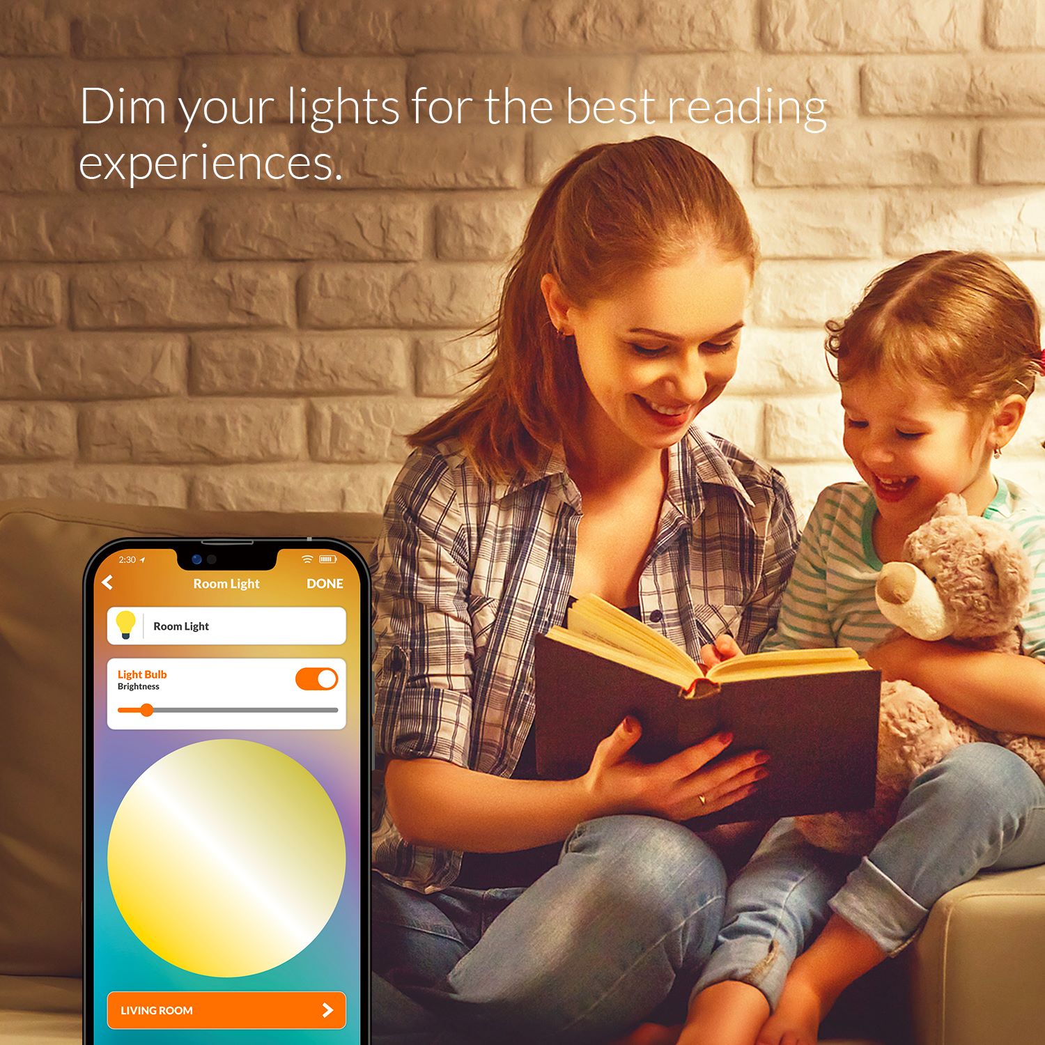 Take full wireless control of your lights. Adjust brightness to your preference and save your favorite settings for quick access. Create the ideal ambiance with just a touch.
