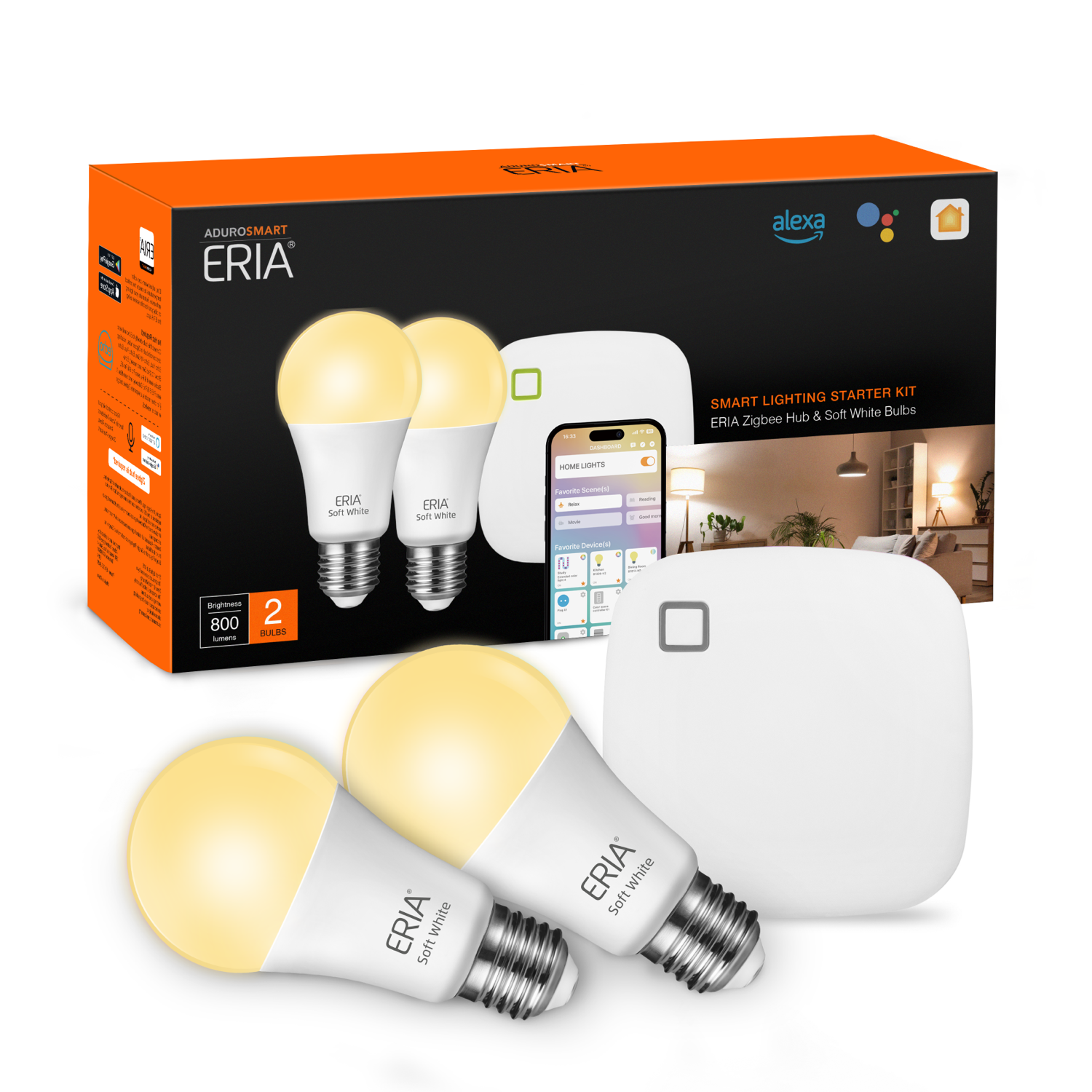 1x ERIA Hub, 2x ERIA Soft White A19 Bulbs, Power Adapter, Ethernet Cable