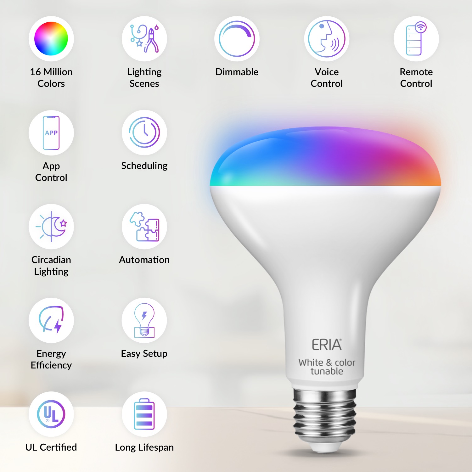 Pair your bulb with the ERIA Hub and App to access the complete smart lighting experience. Control your lights wirelessly, personalize settings, and activate scenes instantly. Set timers, create automations, and let your lighting adapt naturally to your daily routine. Whether you’re home or away, enjoy smarter control, improved energy savings, and enhanced comfort.
