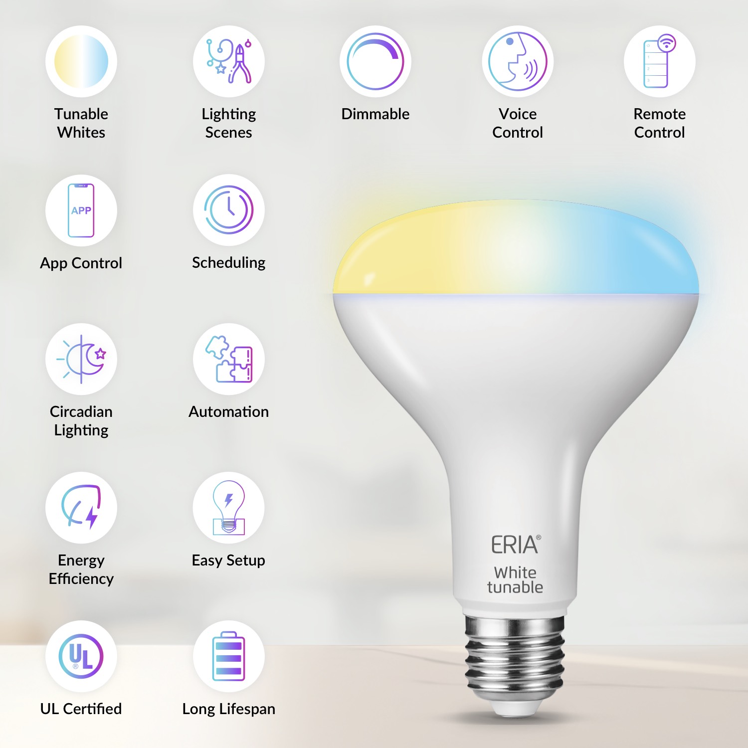 Pair your bulb with the ERIA Hub and App to access the complete smart lighting experience. Control your lights wirelessly, personalize settings, and activate scenes instantly. Set timers, create automations, and let your lighting adapt naturally to your daily routine. Whether you’re home or away, enjoy smarter control, improved energy savings, and enhanced comfort.