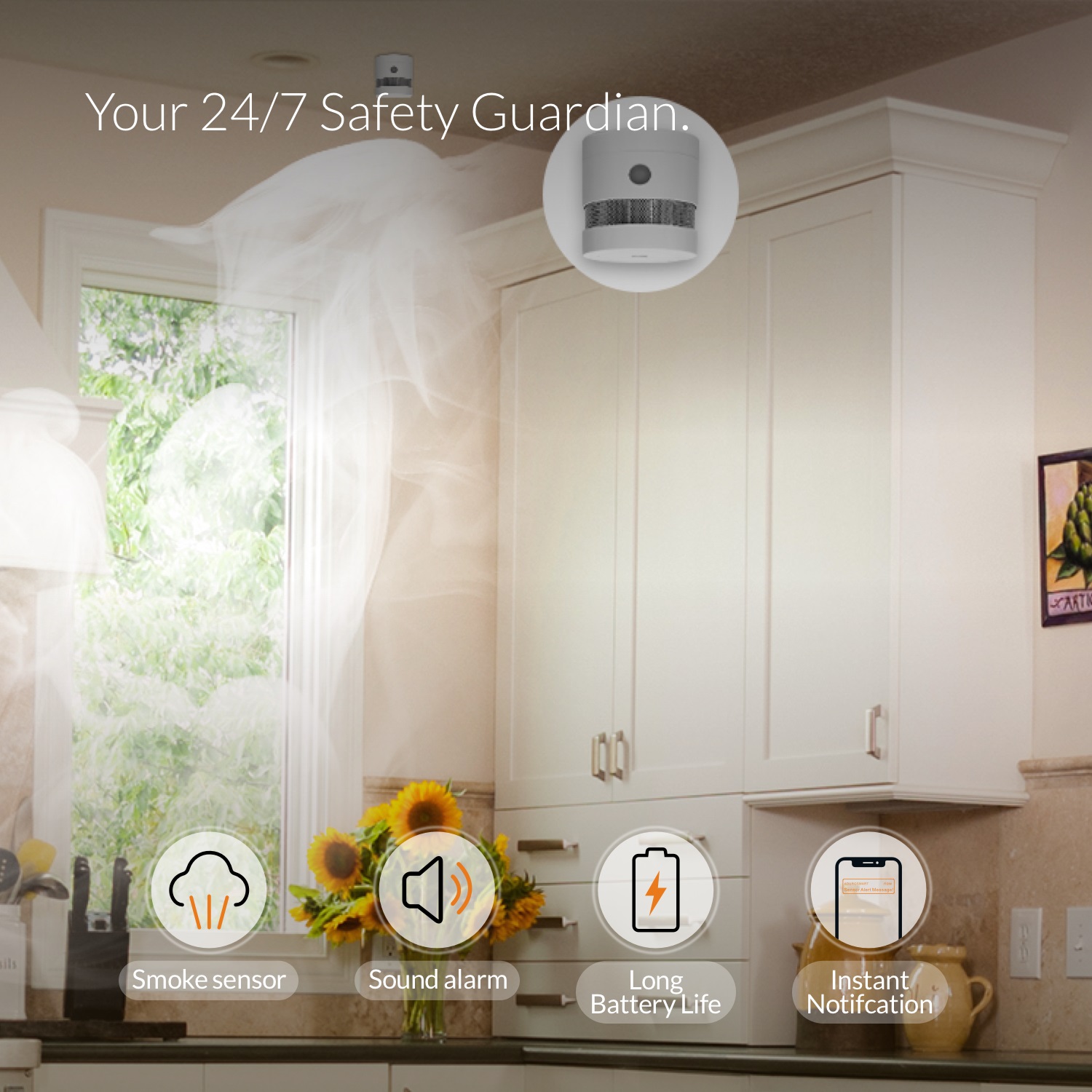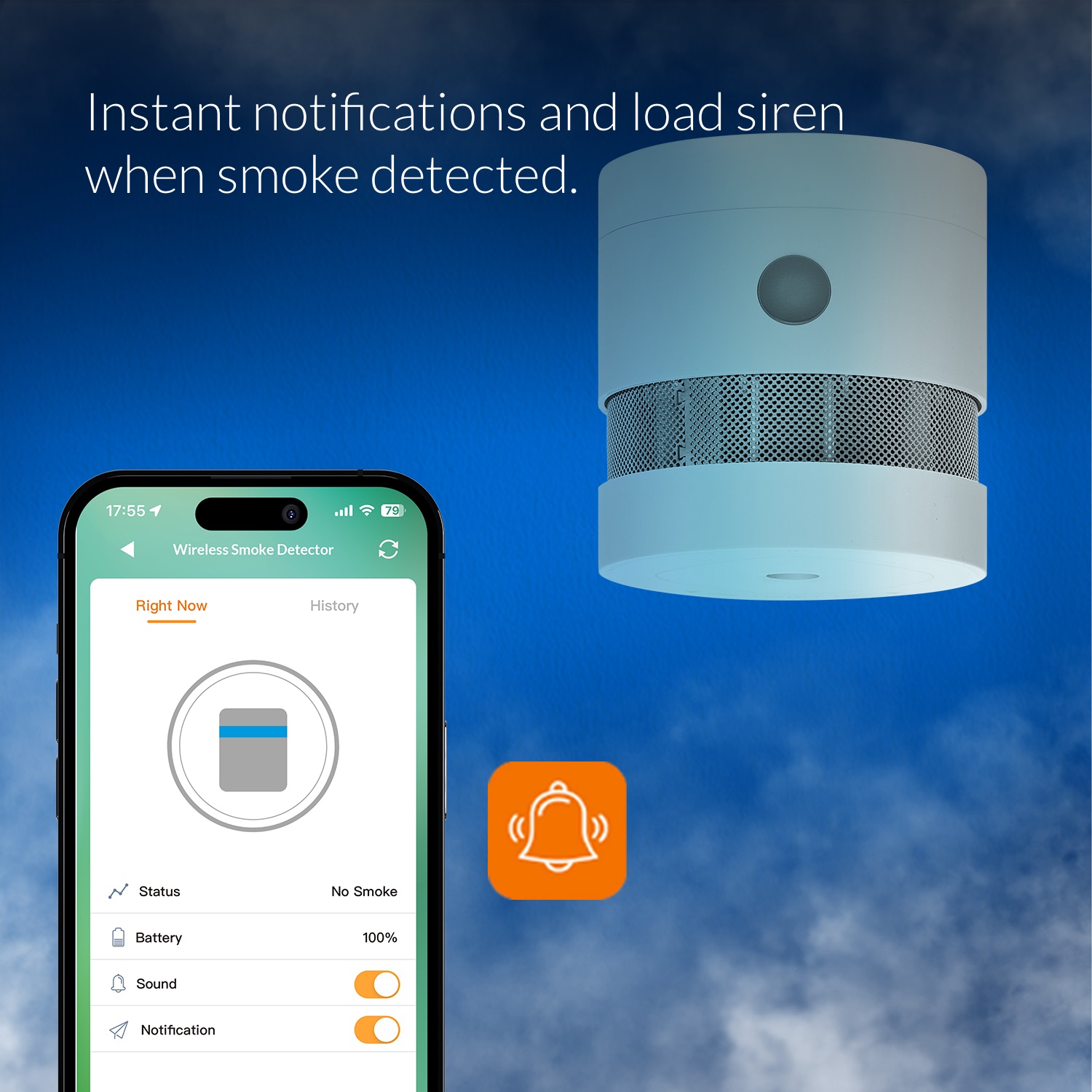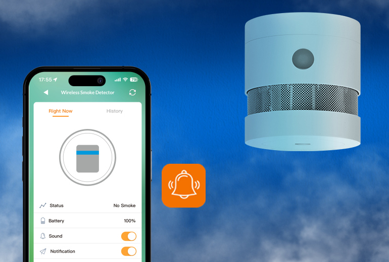 When danger is detected, the smoke sensor sounds a loud alarm and sends real-time push notifications to your smartphone. Stay informed and protect your home - wherever you are.